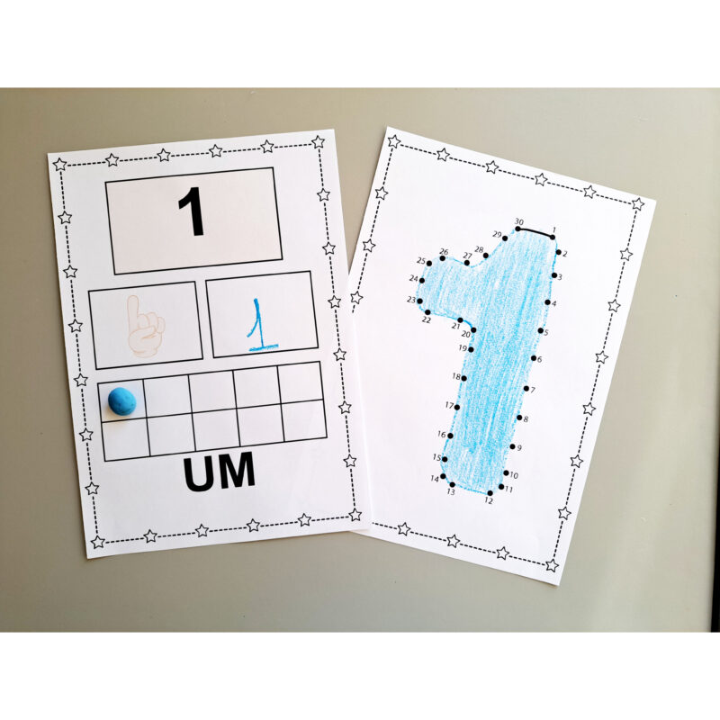 O material trabalha os números de 0 a 10, apresentando em cada página:
