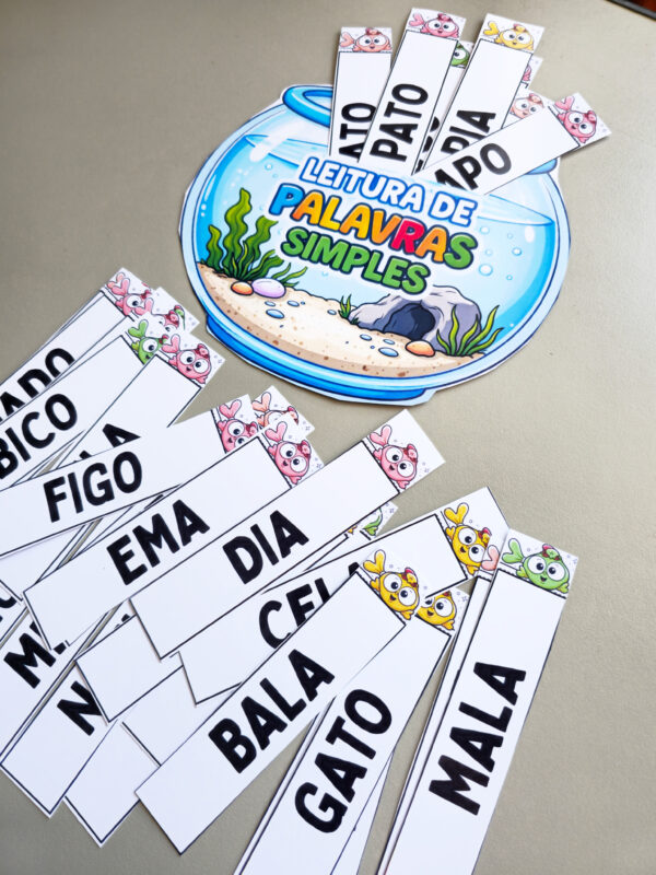 A proposta também pode ser utilizada como brincadeira de pescaria, onde a criança “pesca” o peixinho e realiza a leitura da palavra encontrada.