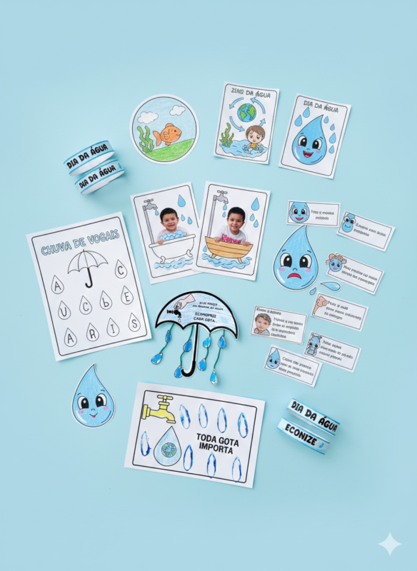 O Kit Completo Dia da Água reúne diversas atividades pedagógicas + painel decorativo, oferecendo tudo o que você precisa para trabalhar o tema de forma lúdica, criativa e consciente.