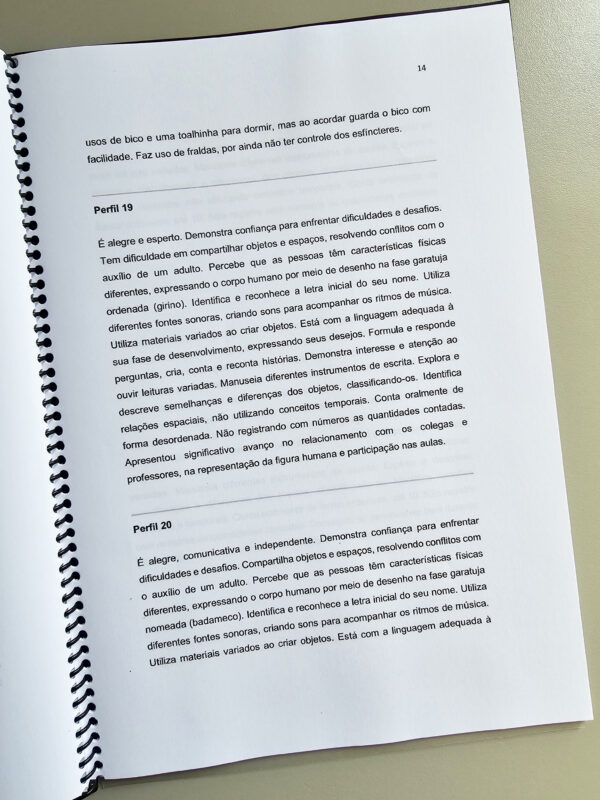 E-book digital com 100 modelos de relatórios individuais, prontos para adaptar conforme o desenvolvimento de cada criança.